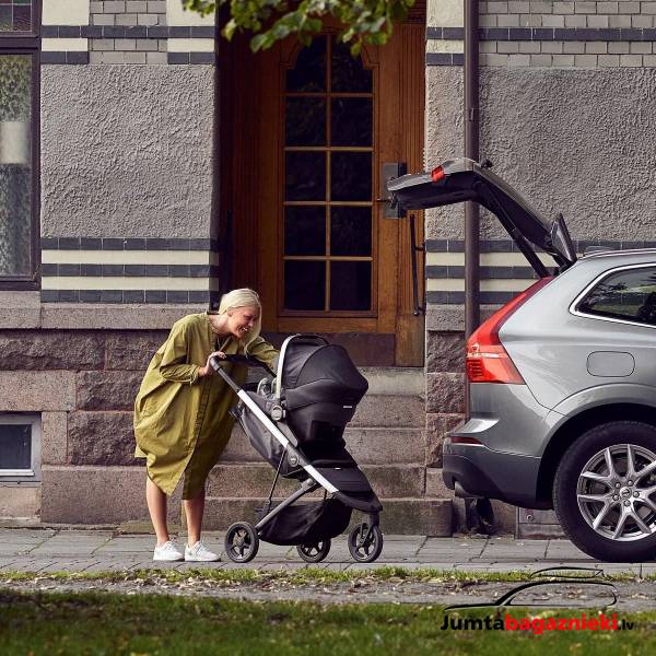 Pārejiet no automašīnas uz ratiem, izmantojot adapteri, kas ļauj ātri un viegli piestiprināt zīdaiņa automašīnas sēdeklīti Thule Spring ratiem.